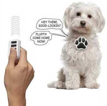 I can always count on SkyMall for at least one hysterical pet device. One that you never knew existed or that you would ever need. The Talking Dog Collar is the latest in a line of very impressive practical yet silly products. Need to call the kids to dinner? Husband hiding-out in the garage? Send them a message via dog collar. You’ll never have to go chasing them again, assuming you can keep control of your dog.