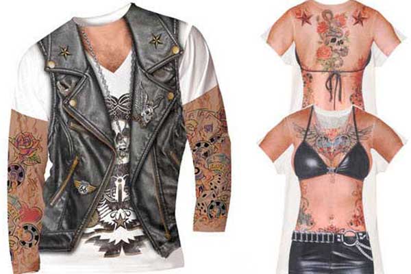 Going to a biker rally and don’t have enough tattoos? Or just too wimpy to get a tattoo on your own? Well thankfully you can still sport the look without ever going through the pain and agony of getting your body inked. With Faux Tattoo T-Shirts, unleash your inner biker babe and don’t forget the body chain!